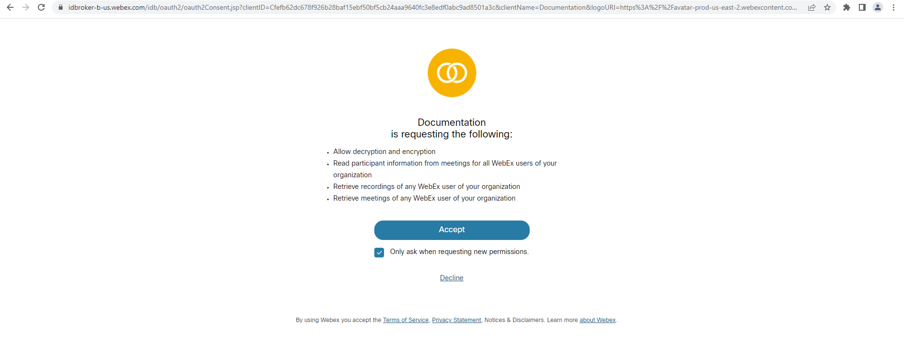 https://webexapis.com/v1/authorize?client_id=Cfefb62dc678f926b28baf15ebf50bf5cb24aaa9640fc3e8edf0abc9ad8501a3c&response_type=code&redirect_uri=https%3A%2F%2Foauth.pstmn.io%2Fv1%2Fcallback&scope=meeting%3admin_schedule_read%20meeting%3admin_recordings_read%20meeting%3admin_participants_read%20Identity%3tokens_read%20Identity%3tokens_write&state=documentation