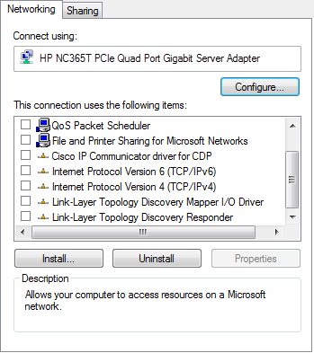 For interception recording, use Windows to configure the NIC properties for all cards by means of the Networking tab of the adapter properties.