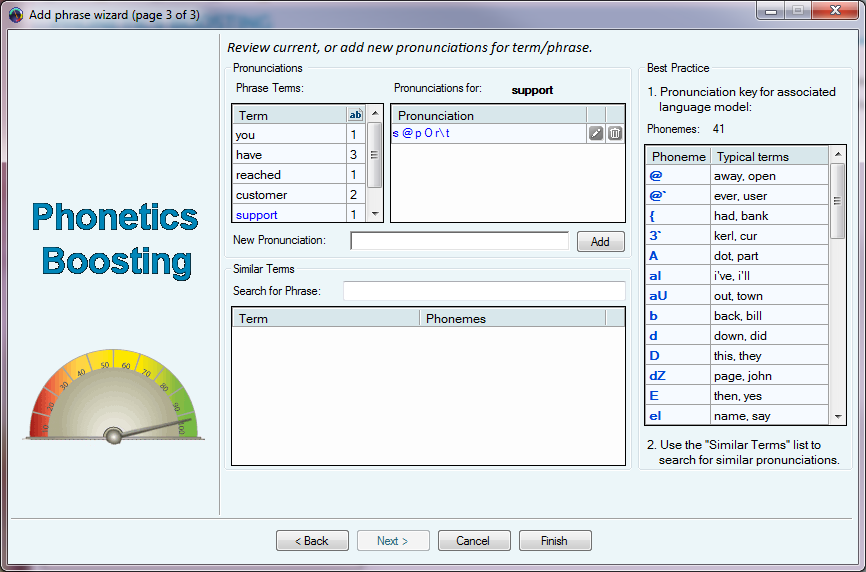 Similar Terms and Phoneme lists help to create pronunciation manually, by searching for similar terms with phonemes or by combining phonemes from the list to create the phonetic representation.