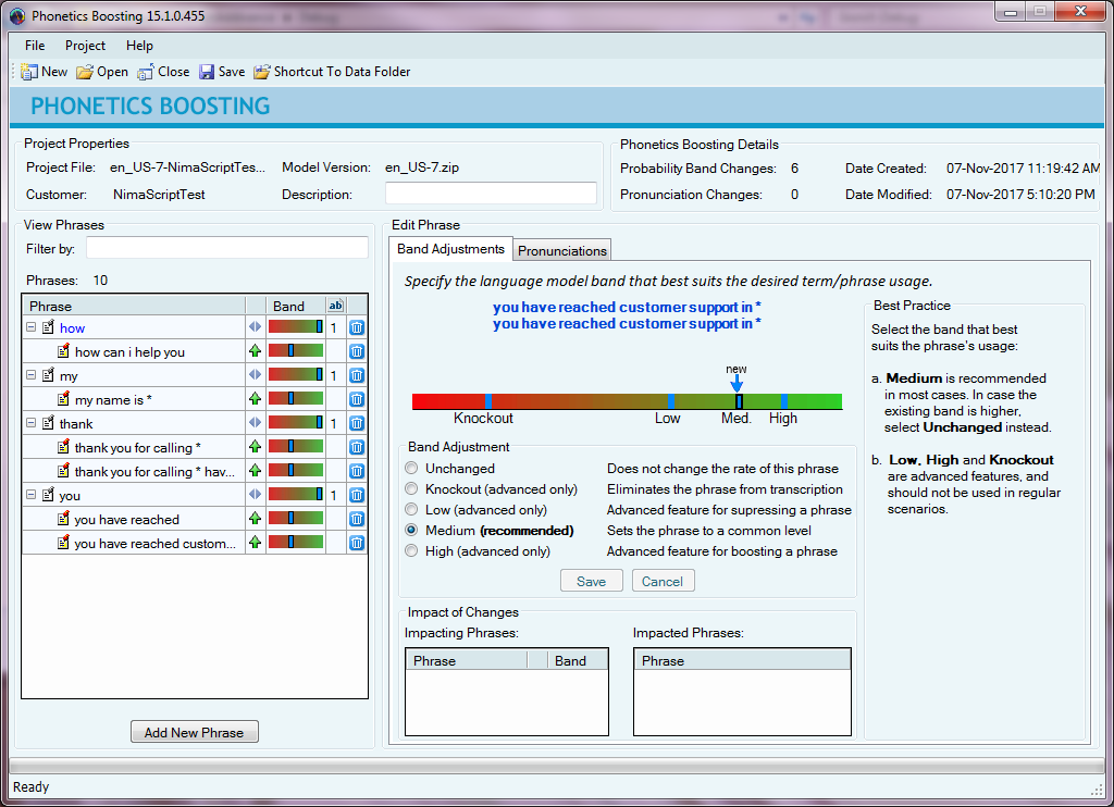 Impacting Phrases: Shows the impact of the new term or the phrase on the Speech Recognition engine’s vocabulary. The Band column reflects the probability of the term/phrase, as either