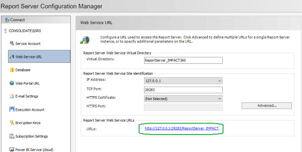 1. Set the Virtual Directory with same value as in Report Manager Virtual Directory, in the Reporting Services role in the Enterprise Manager (usually: Reports_IMPACT360).